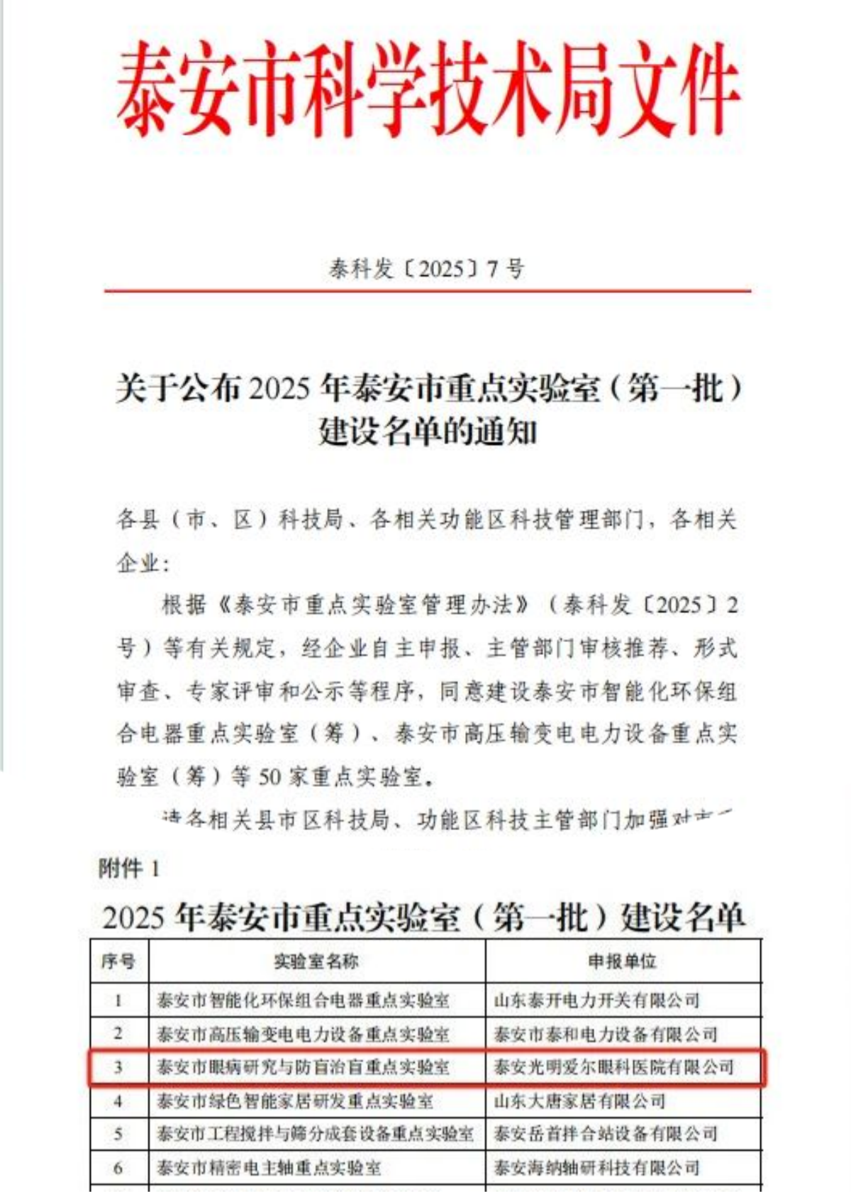? ? ? ? 近日,泰安市科學(xué)技術(shù)局公布2025年泰安市重點(diǎn)實(shí)驗(yàn)室(第一批)建設(shè)名單的通知,我院眼病研究與防盲致盲重點(diǎn)……