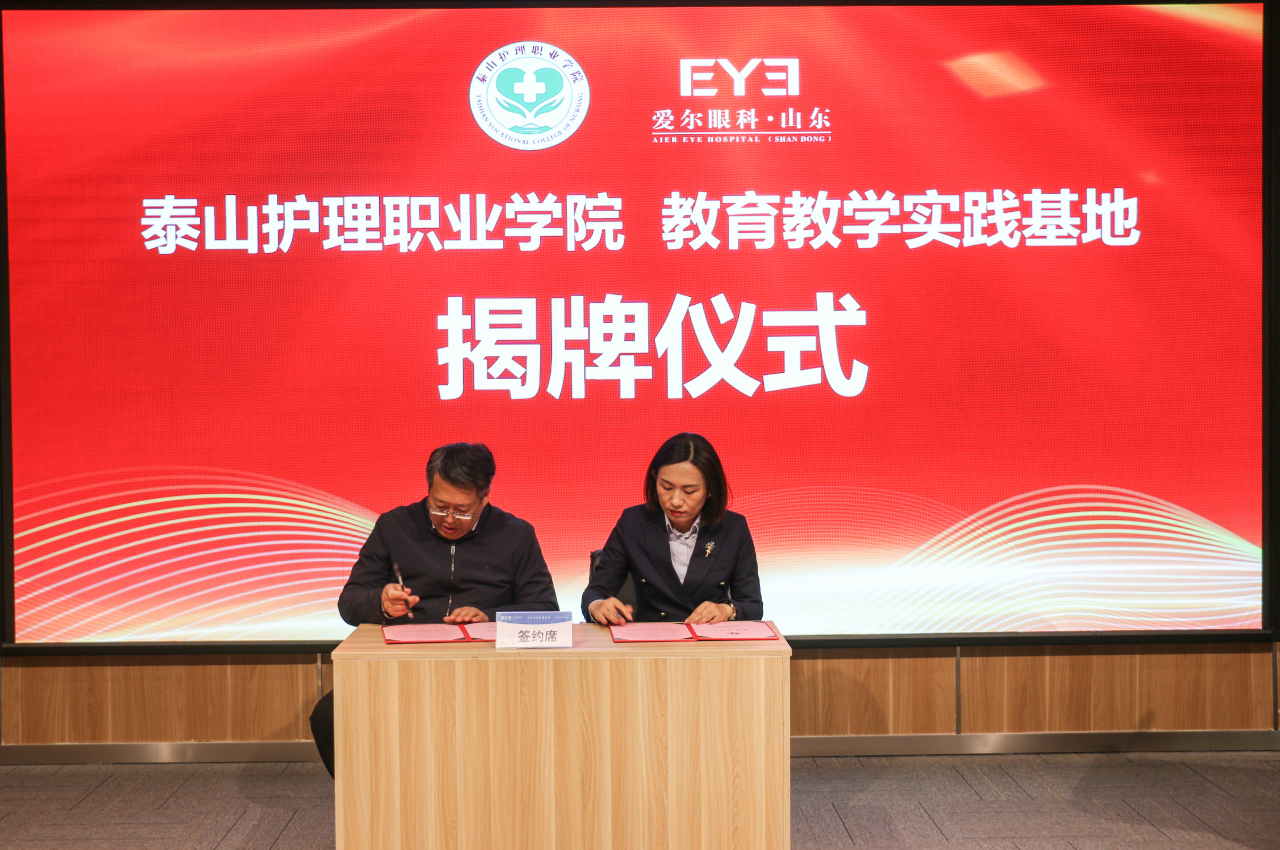 會上,雙方代表進行了簽約儀式并共同見證了教育教學實踐基地和人才培養(yǎng)培訓基地的揭牌儀式,標志著泰山護理職業(yè)學院與愛爾眼科山東省區(qū)的合作正式啟動。