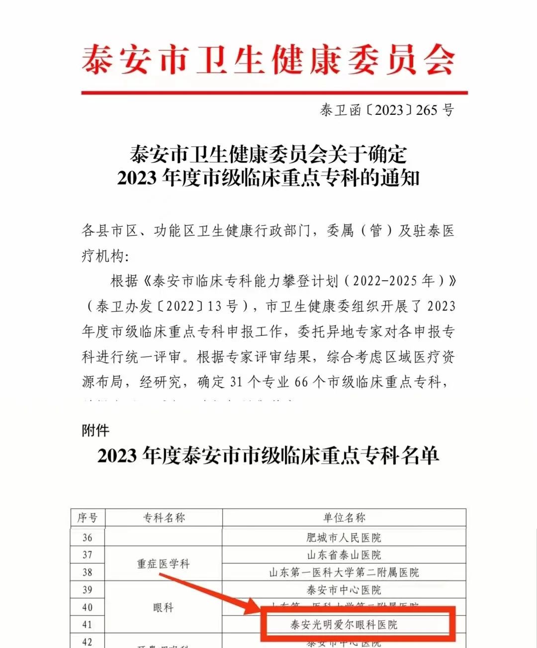 喜報(bào)!泰安光明愛爾眼科醫(yī)院評審為市級臨床重點(diǎn)???!
