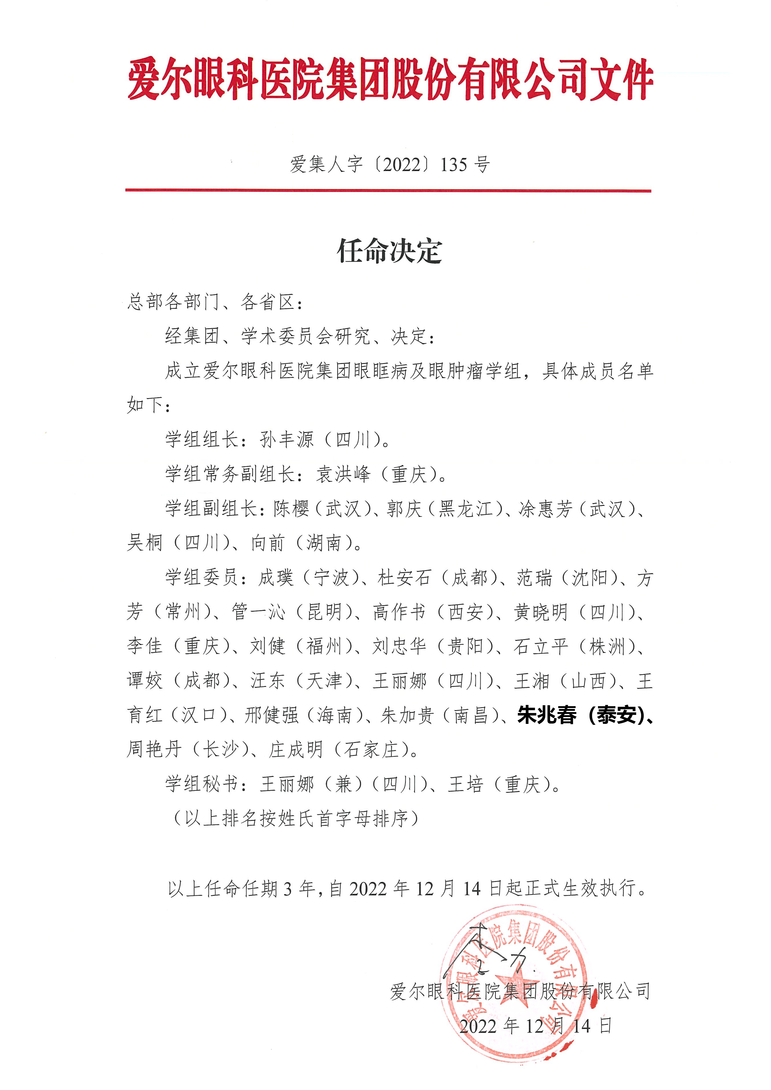 經(jīng)集團、學術(shù)委員會研究決定成立愛爾眼科醫(yī)院集團眼眶病及眼腫瘤學組,由孫豐源教授任組長,我院眼表淚道科主任朱兆春當選為學組委員。??